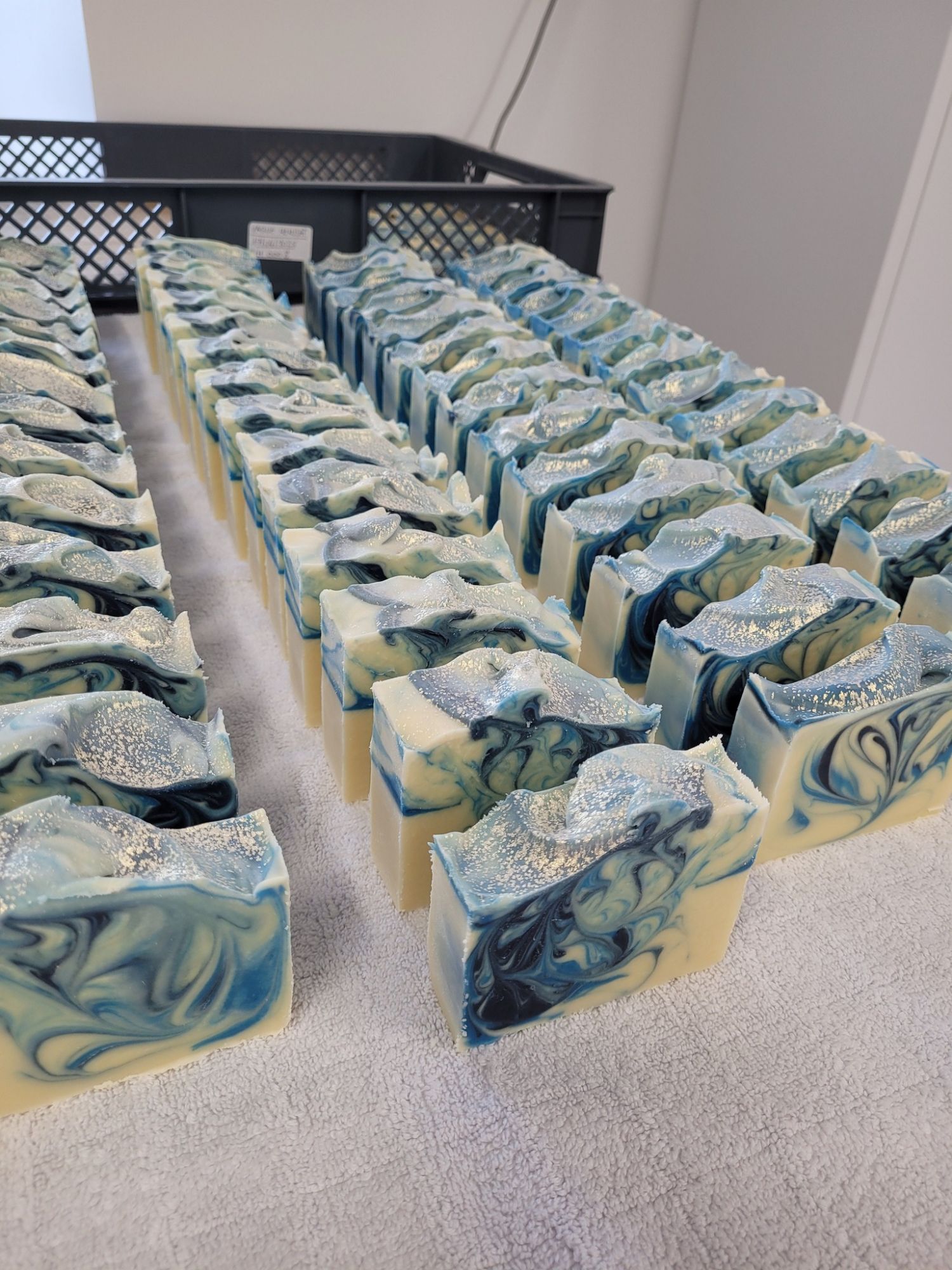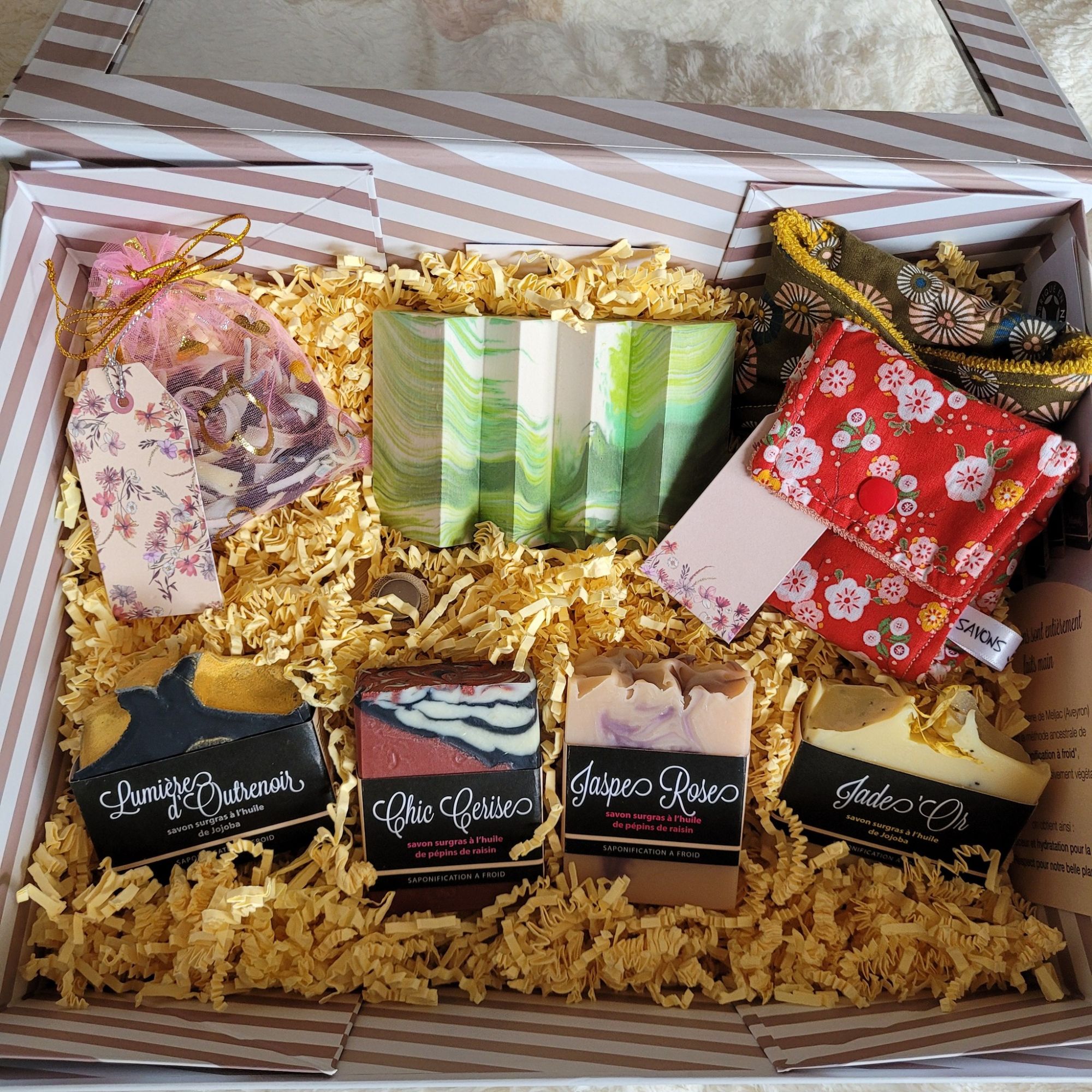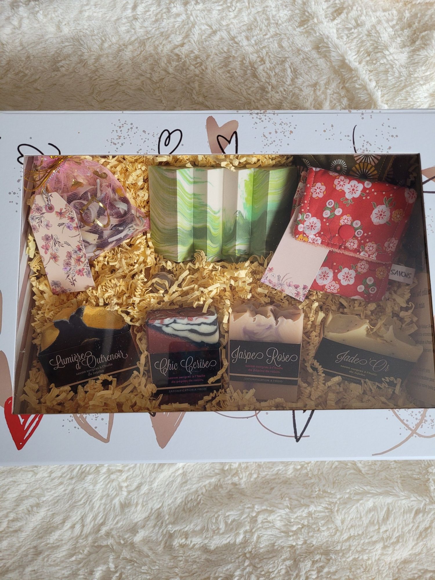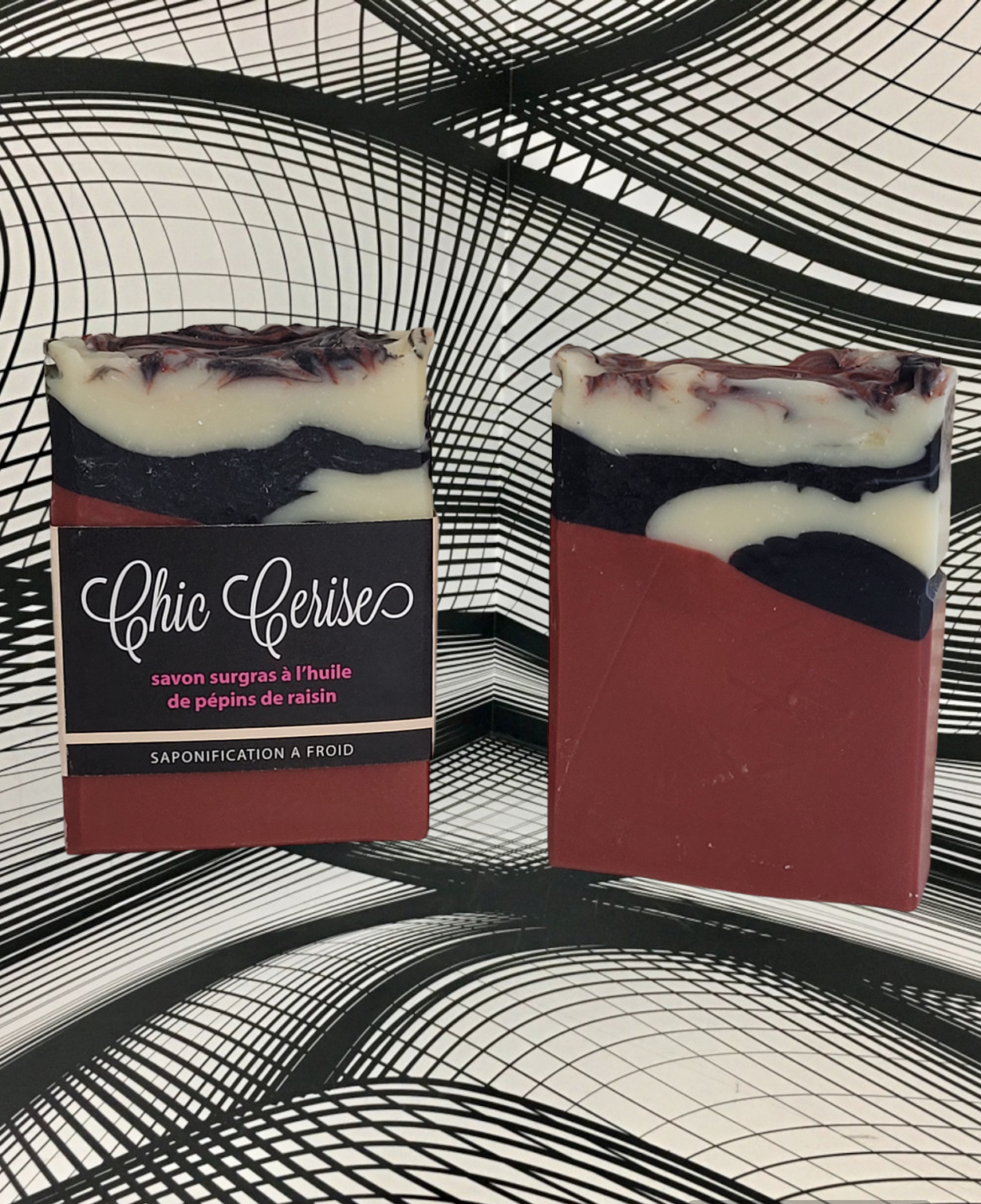 Savons saponifiés à froid : Doudou, Aventurine, Chocolat mousse, Vague Hokusaï, Jaspe rose, Jade’Or, Fleur d’argile, Chic cerise Lumière d’Outrenoir.