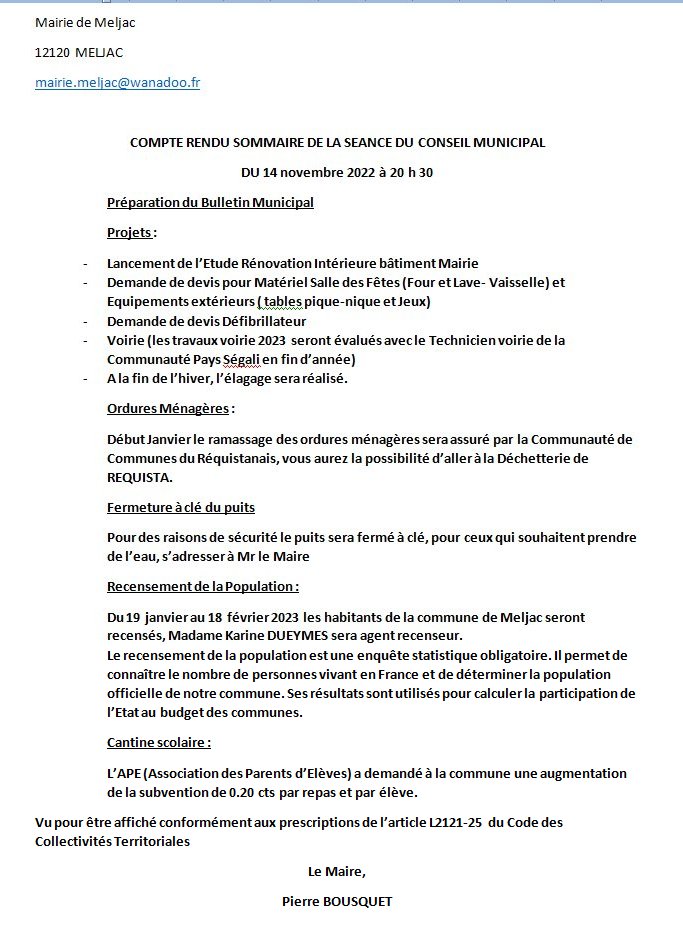 En pratique, ce projet n’aboutira pas ; le bureau de la mairie de Meljac s’installa sur le palier du 1er étage de l’école. On se souvient de M. Ginestet tenant ainsi le secrétariat au-dessus de sa classe.