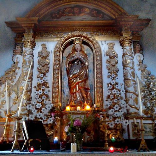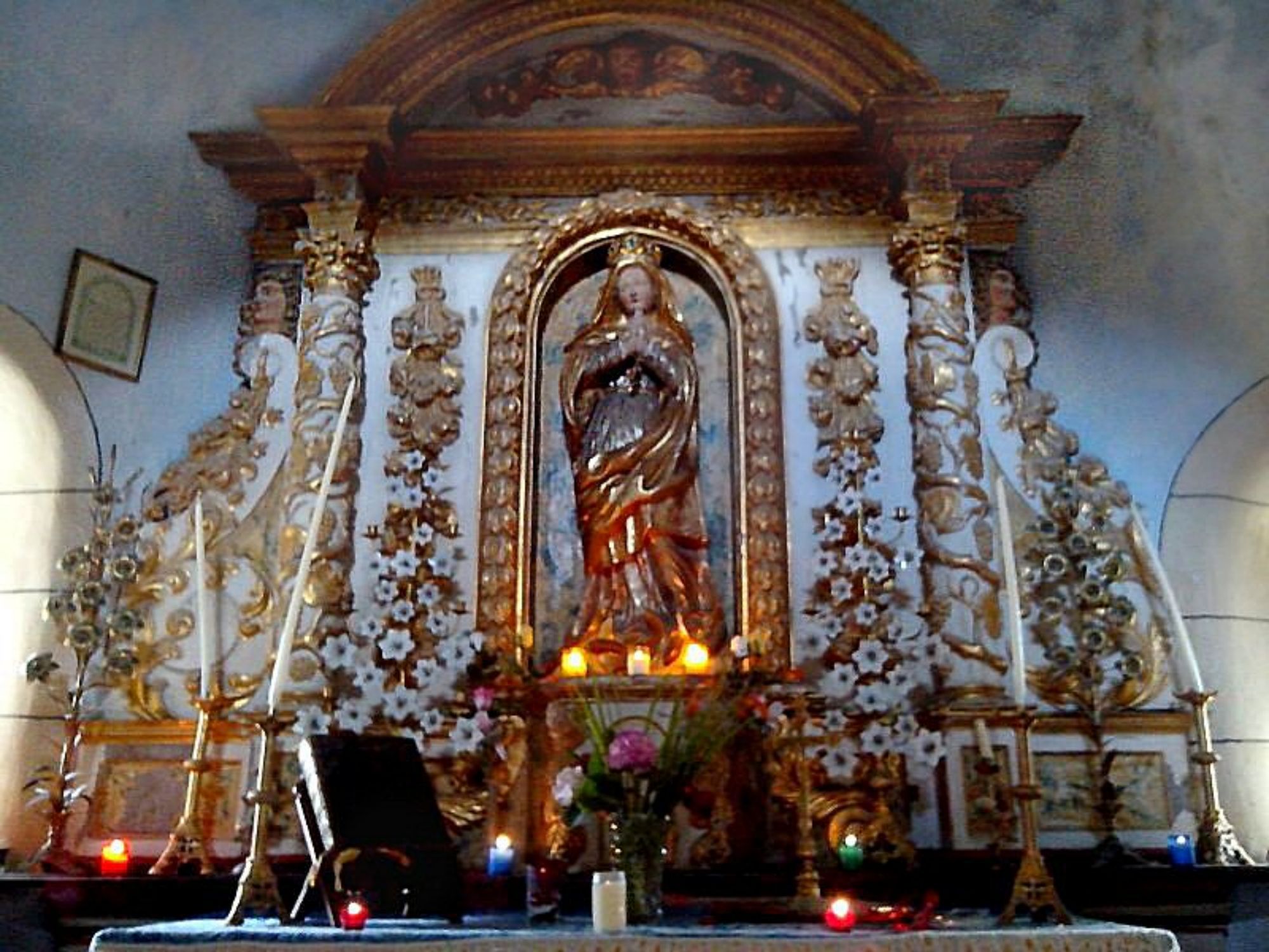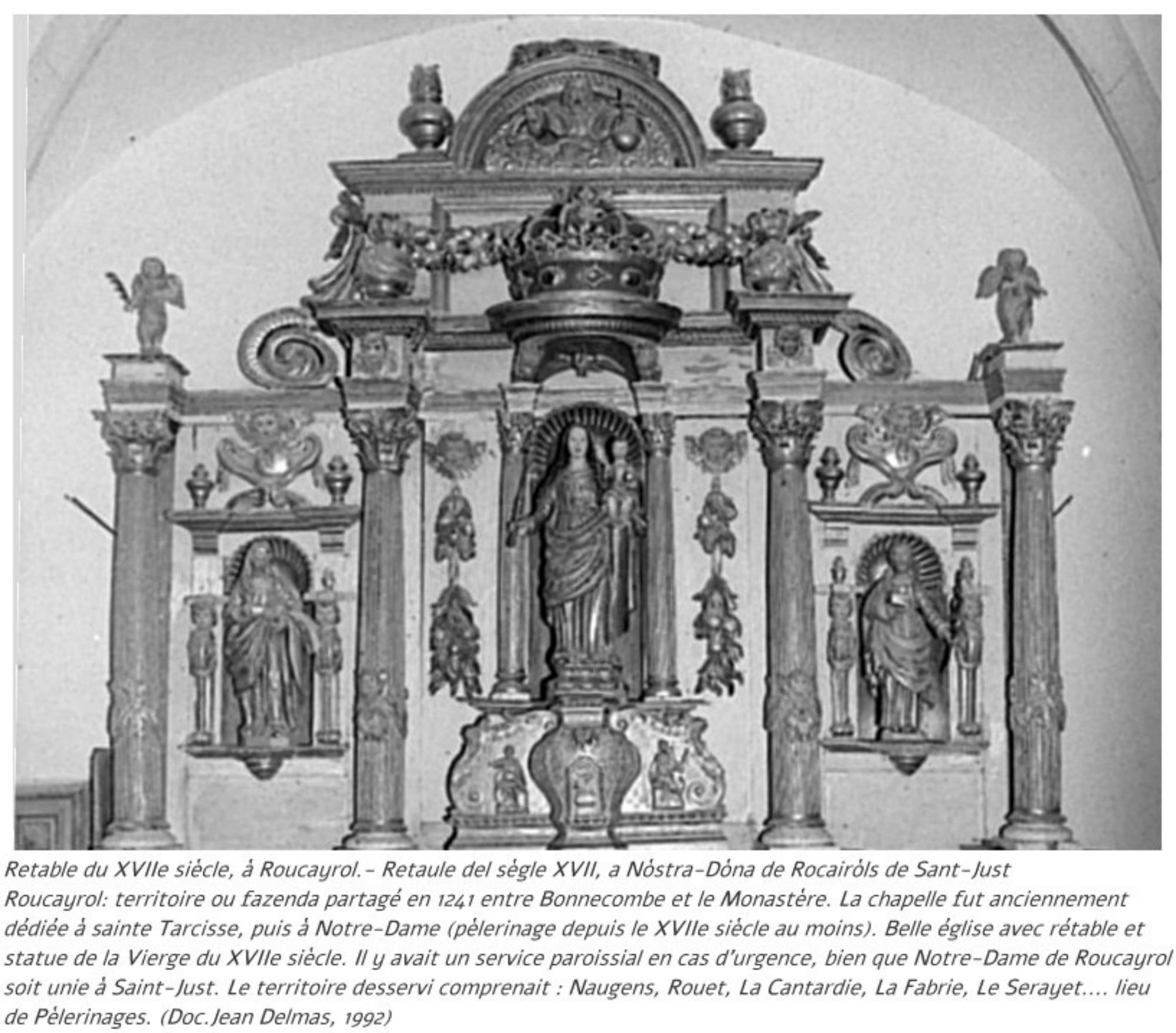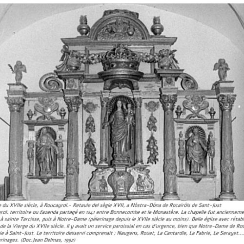 A l’intérieur de la chapelle un superbe retable de bois orné de fleurs, de fruits, d’anges, de colonnes avec, au centre une niche qui reçoit la statue de Notre-Dame de Roucayrol.