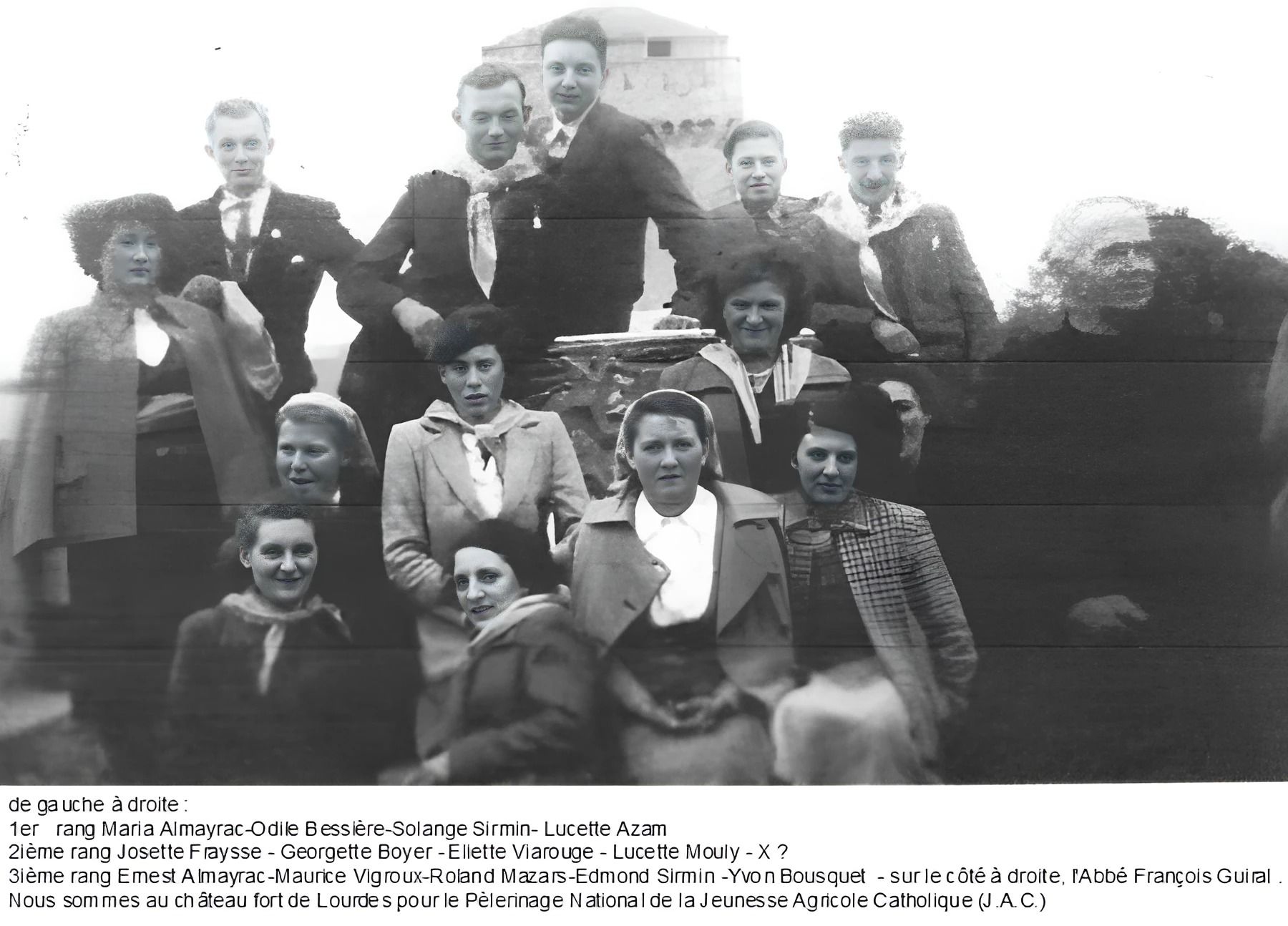 On a connu également les pèlerinages à Lourdes organisés par le mouvement national «Jeunesse Agricole Catholique (JAC) » dont on voit ci-dessous une image (traitée par l'I.A.) des années 1950 avec un groupe mixte de Meljacois on visite au château fort de Lourdes.