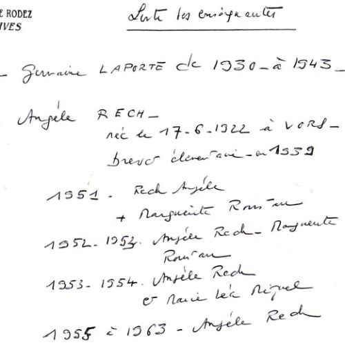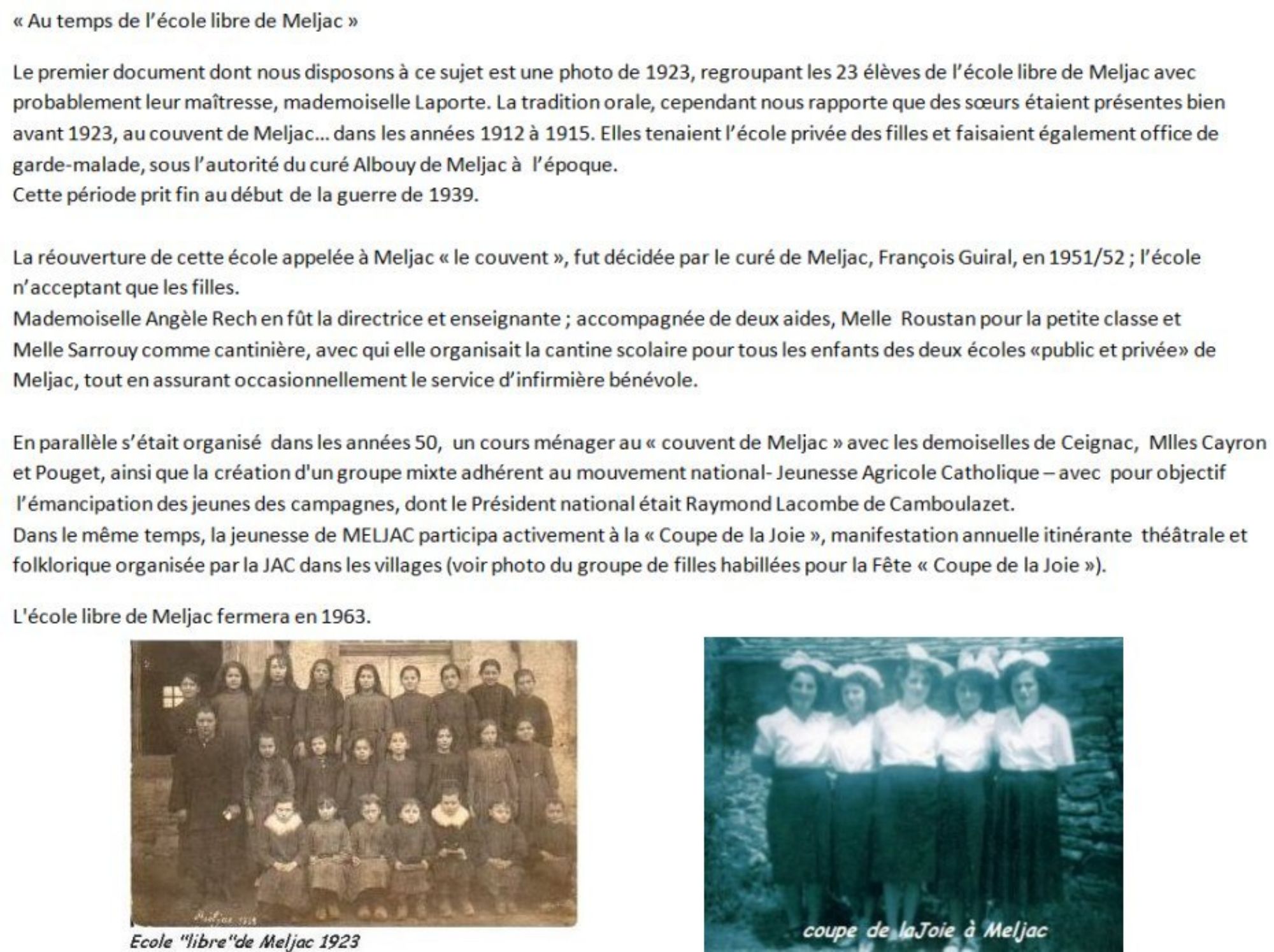 Mademoiselle Angèle Rech en fût la directrice et enseignante ; accompagnée de deux aides, Melle Roustan pour la petite classe et Melle Sarrouy comme cantinière, avec qui elle organisait la cantine scolaire pour tous les enfants des deux écoles «public et privée» de Meljac, tout en assurant occasionnellement le service d’infirmière bénévole.