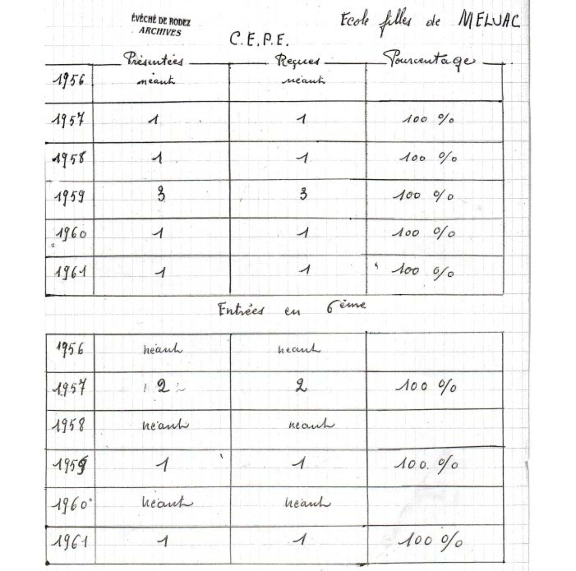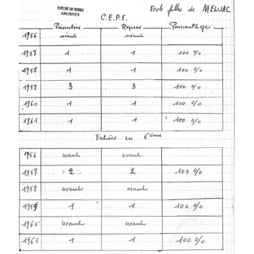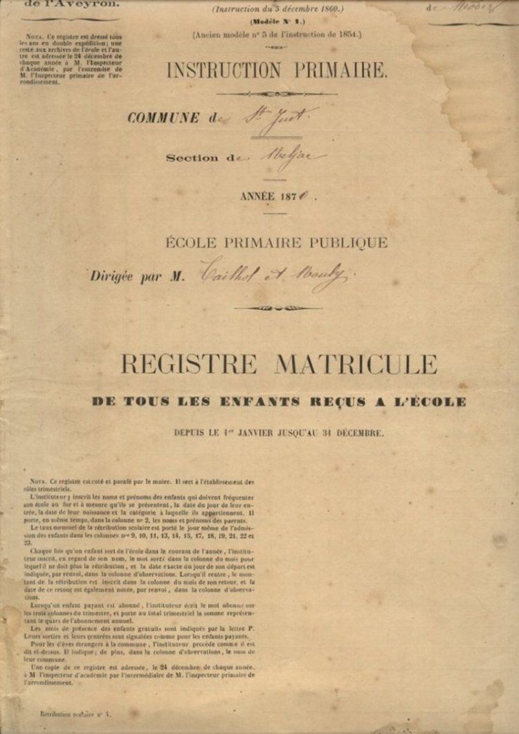 Les archives que nous avons pu trouver et exploiter sont essentiellement constituées de documents portant sur la période 1870-1969 qui, sous des noms ou des formats différents, selon leur époque ou leur usage, contiennent principalement les listes des élèves de l’école de Meljac, telles que les ont dressées les instituteurs (trices) en poste : registres matricules des écoliers (RM), registres d’appel journalier(RA), la liste annuelle d’inscription des élèves, des «mots d’excuses » de parents motivant l’absence de leurs enfants.