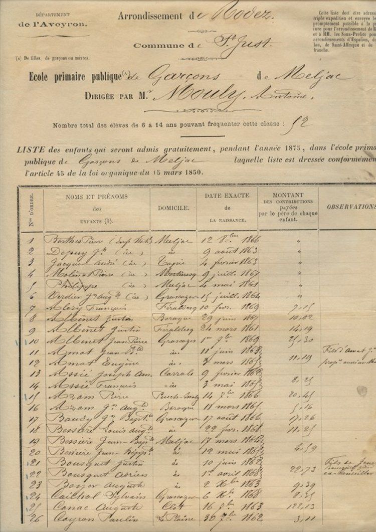 Nous devons à l’obligeance de Monsieur Aimé Mouly (Castres - la Tapie de Meljac), arrière-petit-fils de Monsieur Antoine Mouly, le portrait de ce dernier, instituteur à Meljac pendant près de 20 ans, de 1870 à 1889.