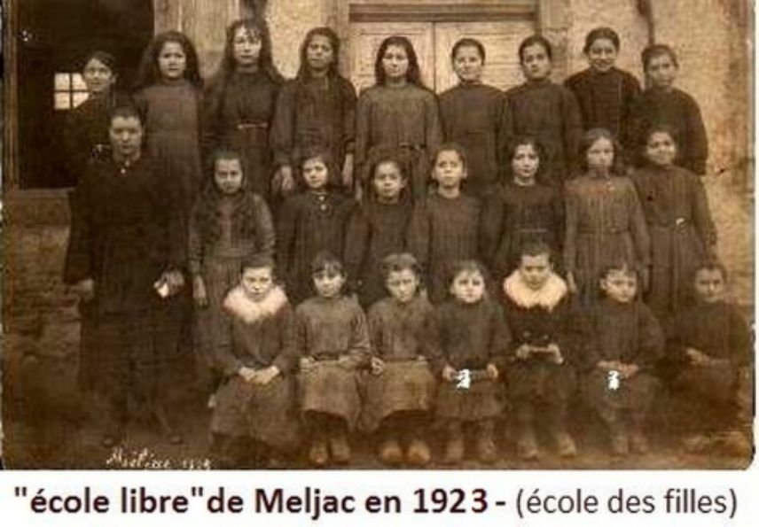 Le premier document dont nous disposons à ce sujet est une photo de 1923 (traitée avec l'I.A.), regroupant les 23 élèves de l’école libre de Meljac avec probablement leur maîtresse, mademoiselle Laporte.
