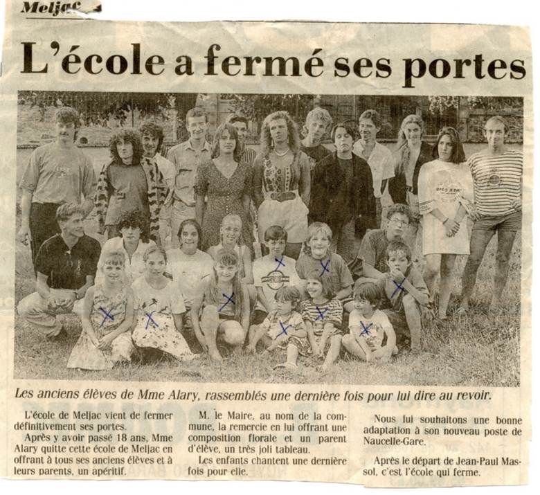 "L'école a fermé ses portes" titre l'article paru en 1991 dans la rubrique "Meljac" de Centre Presse. Sur la photo ci-contre (cliquer sur la photo pour l'agrandir), 9 enfants sont marqués d'une croix les désignant comme les élèves de la dernière classe ; tandis que des anciens élèves les ont rejoints pour la photographie. L'article se conclut avec "nostalgie" sur le "départ de Jean-Paul Massol" de Meljac qui a précédé la fermeture de l'école.