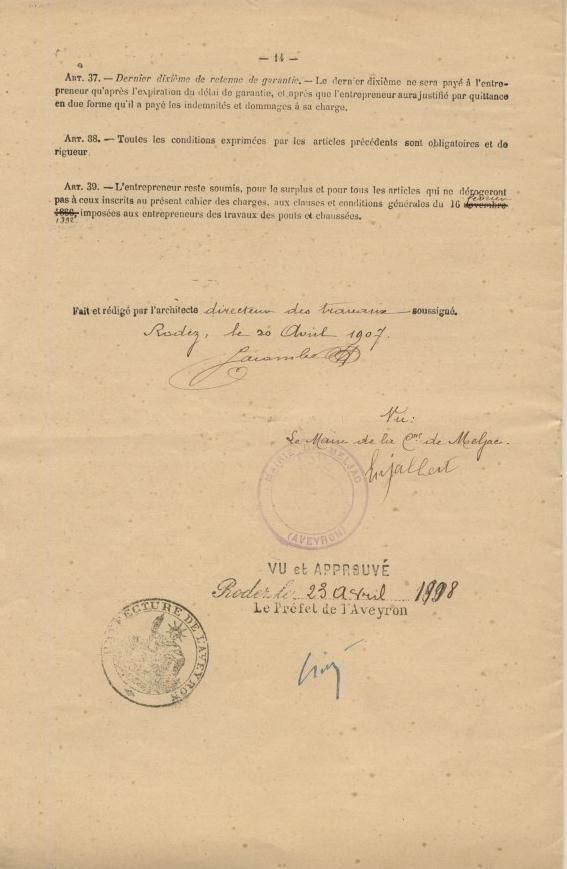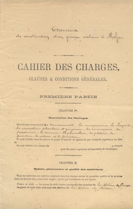 S’y trouvait aussi, le dossier de construction de l’école de Meljac avec son cahier des charges établi par l’architecte de la mairie visé par le maire le 20 avril 1907 et approuvé par la préfecture le 23 avril 1908